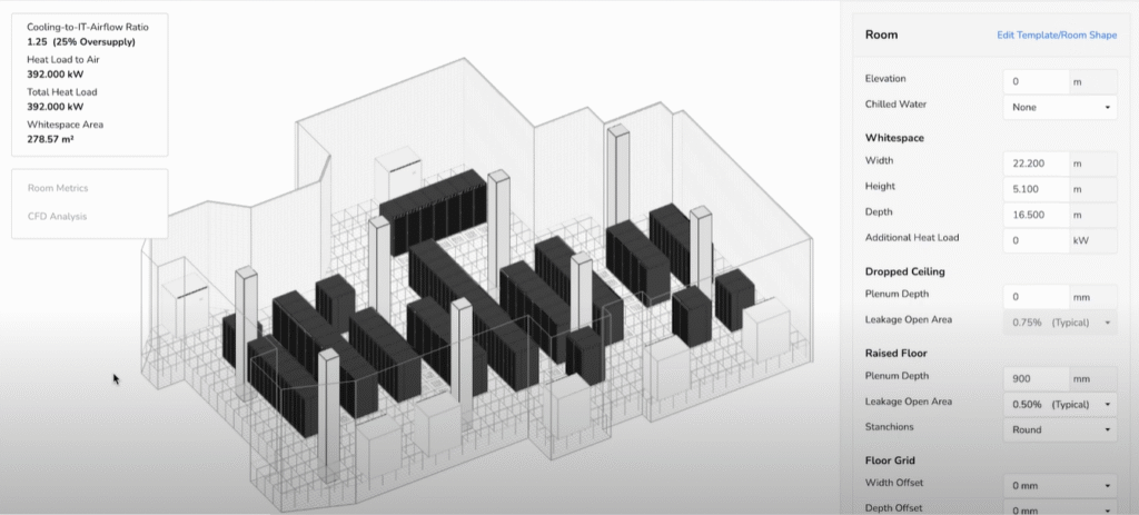 Beginning a cooling analysis with EcoStruxure™ IT Design CFD involves creating a digital twin of the data center environment. Users input physical layout parameters including room dimensions, equipment locations, and infrastructure specifications. The software’s intelligent modeling system incorporates pre-built models for common data center equipment, ensuring accurate representation of real-world thermal characteristics.